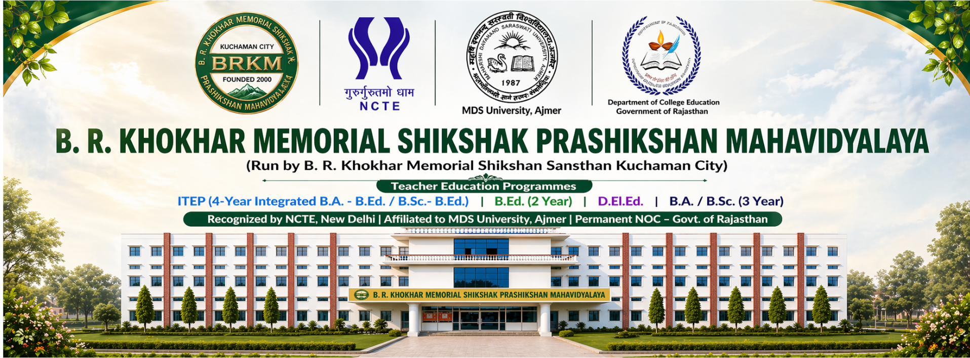 Established in 2000, B. R. KHOKHAR MEMORIAL SHIKSHAK PRASHIKSHAN MAHAVIDYALAYA is a reputed educational institution located in Kuchaman City, (Didwana-Kuchaman) Rajasthan. Registered under the Society Registration Act, 1958 (Registration No. 145/Nagaur/2000-01 dated 28th July 2000), the institution was founded by Shri Govinda Ram Sesama with the vision of providing quality education and professional training. Over its journey of 23 years, the institution has grown significantly and now caters to over 2800 students, offering diverse academic and professional programs.